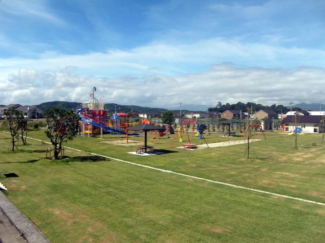大型複合遊具、ロープウェイ、ブランコ、幼児用ブランコ、幼児用滑り台、サンゴクライム、シーソー、スイング遊具、砂場、テニスコート、野外ステージ、多目的広場、ランニング周回コース、あずまや、ベンチ、野鳥観察小屋