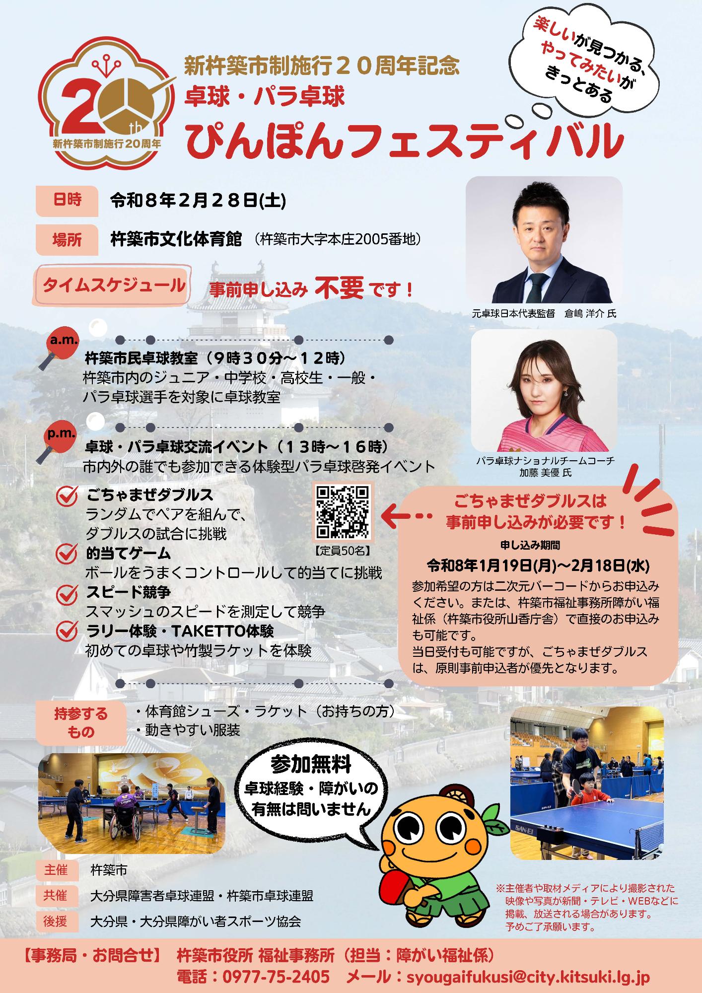 本年、市制施行20周年の大きな節目を迎えるにあたり、その記念事業の一環として「ぴんぽんフェスティバル」を開催いたします。本事業は卓球・パラ卓球の振興・普及を図るとともに、障がいの有無にかかわらず、すべての市民が相互に尊重し合い、安全に暮らせる「地域共生社会」の実現を目的としております。