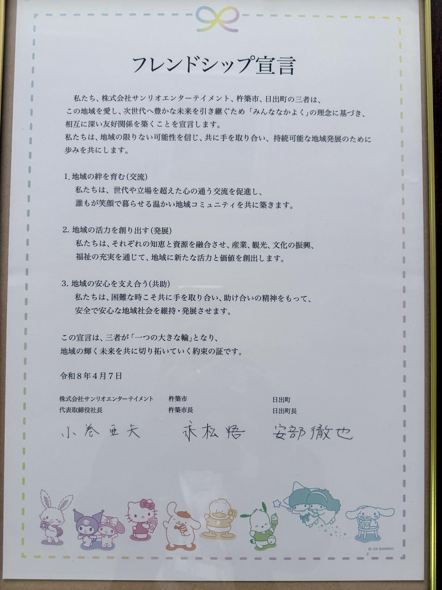 株式会社サンリオエンターテイメント、杵築市、日出町の三者によるフレンドシップ宣言を行いました